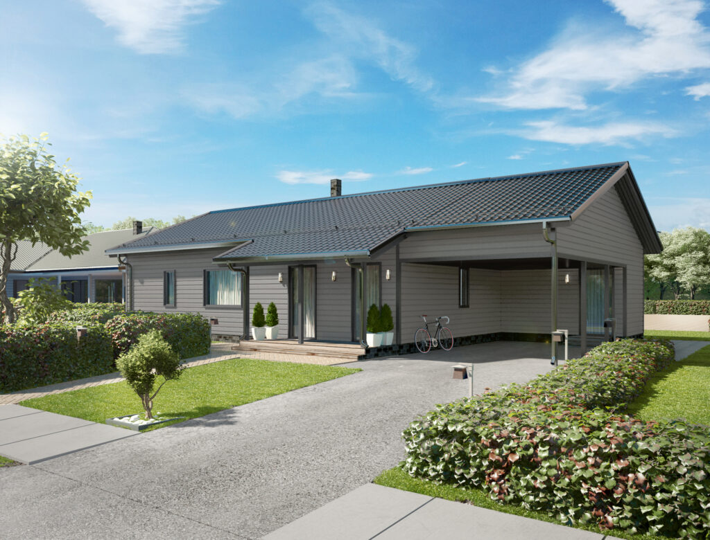T137 – Timber 137 je moderní přízemní dům s krytým parkovacím stáním a prostornou terasou, ideální pro rodinu, která hledá komfortní a praktické bydlení.