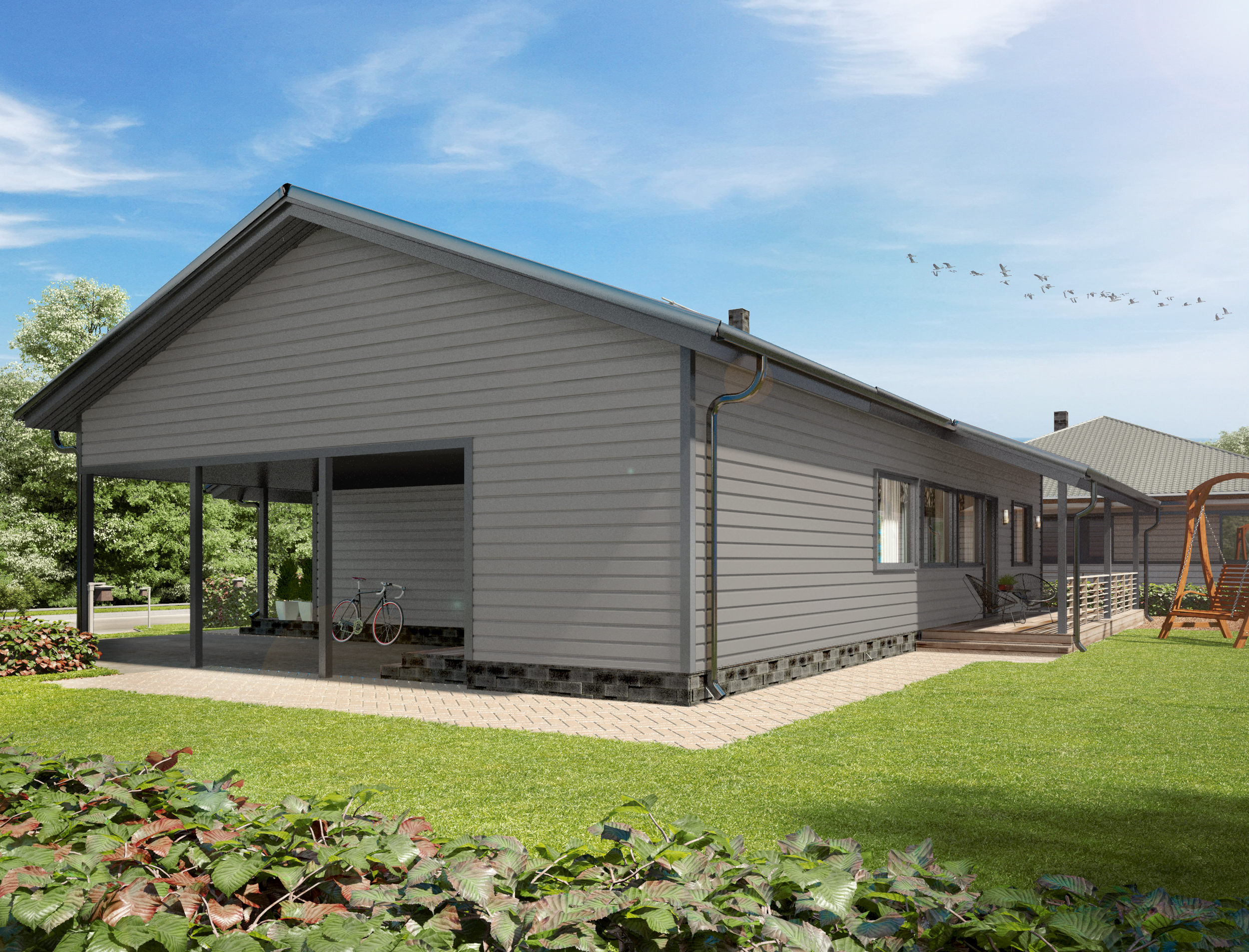 T137 – Timber 137 je moderní přízemní dům s krytým parkovacím stáním a prostornou terasou, ideální pro rodinu, která hledá komfortní a praktické bydlení.