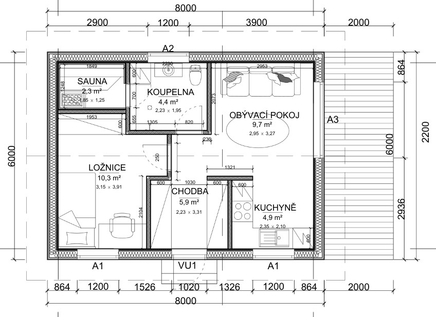 - Sauna – 2,3 m²