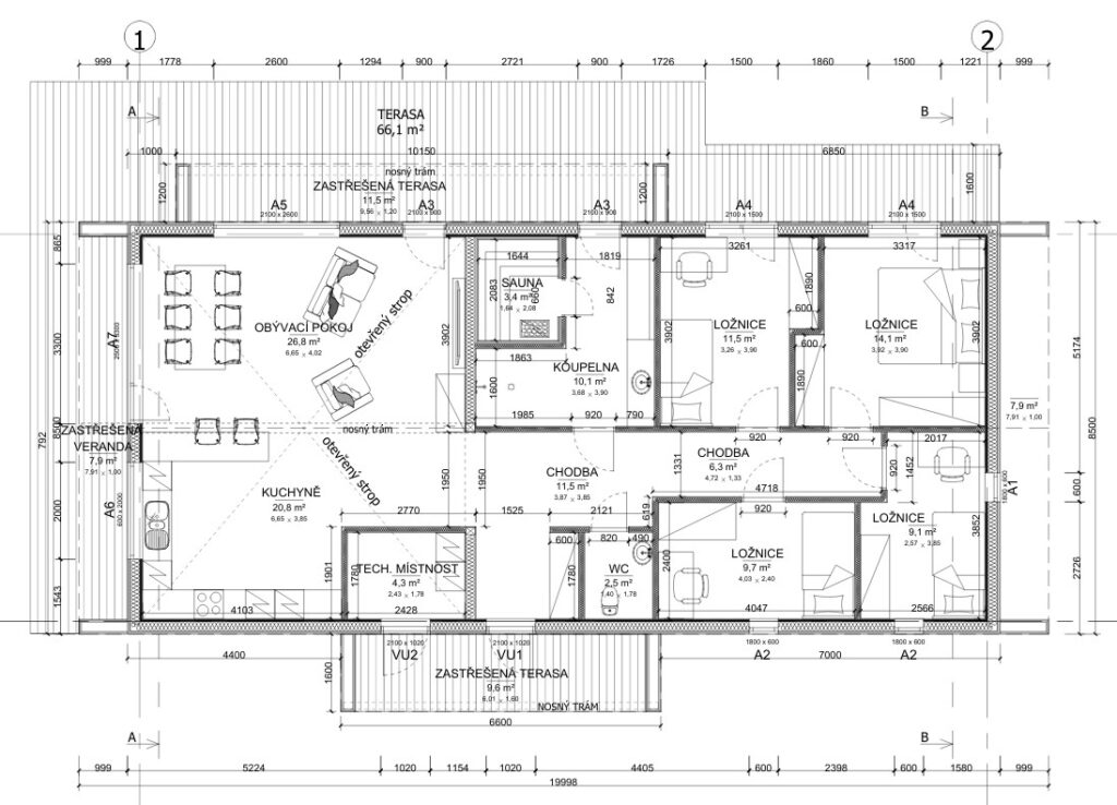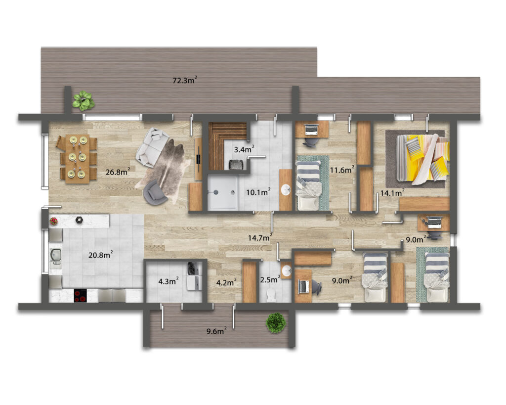 Velkorysý obývací prostor s otevřeným stropem, čtyři ložnice a prostorná terasa o ploše více než 70 m² dělají z tohoto domu ideální řešení pro rodinné bydlení nebo rekreační sídlo.