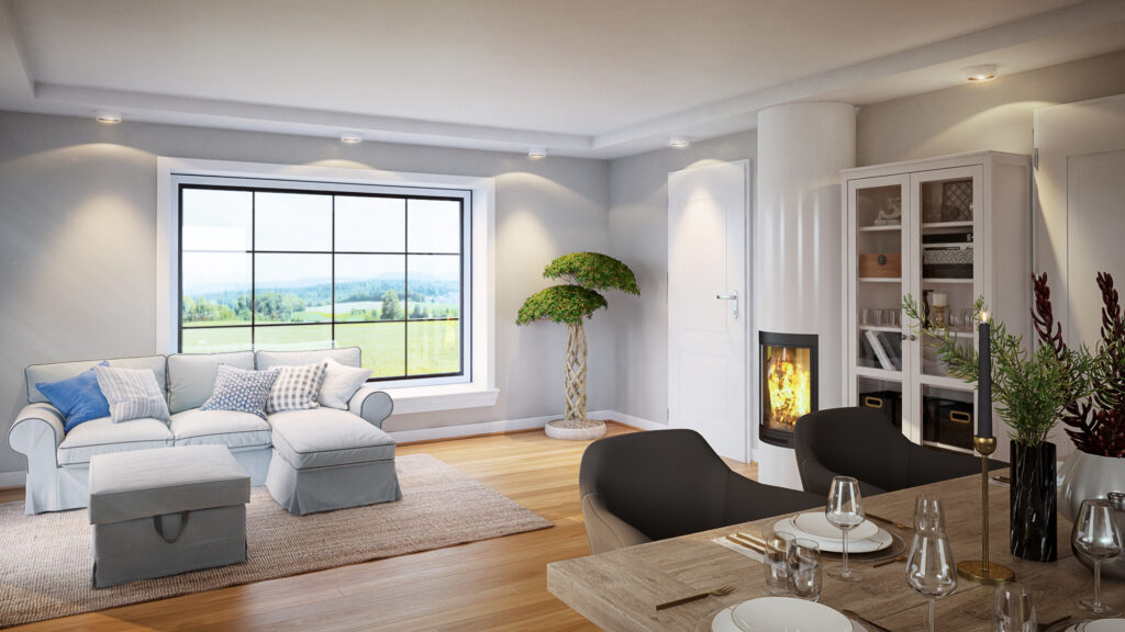 ✅ Velký obývací prostor s jídelnou a krbem
