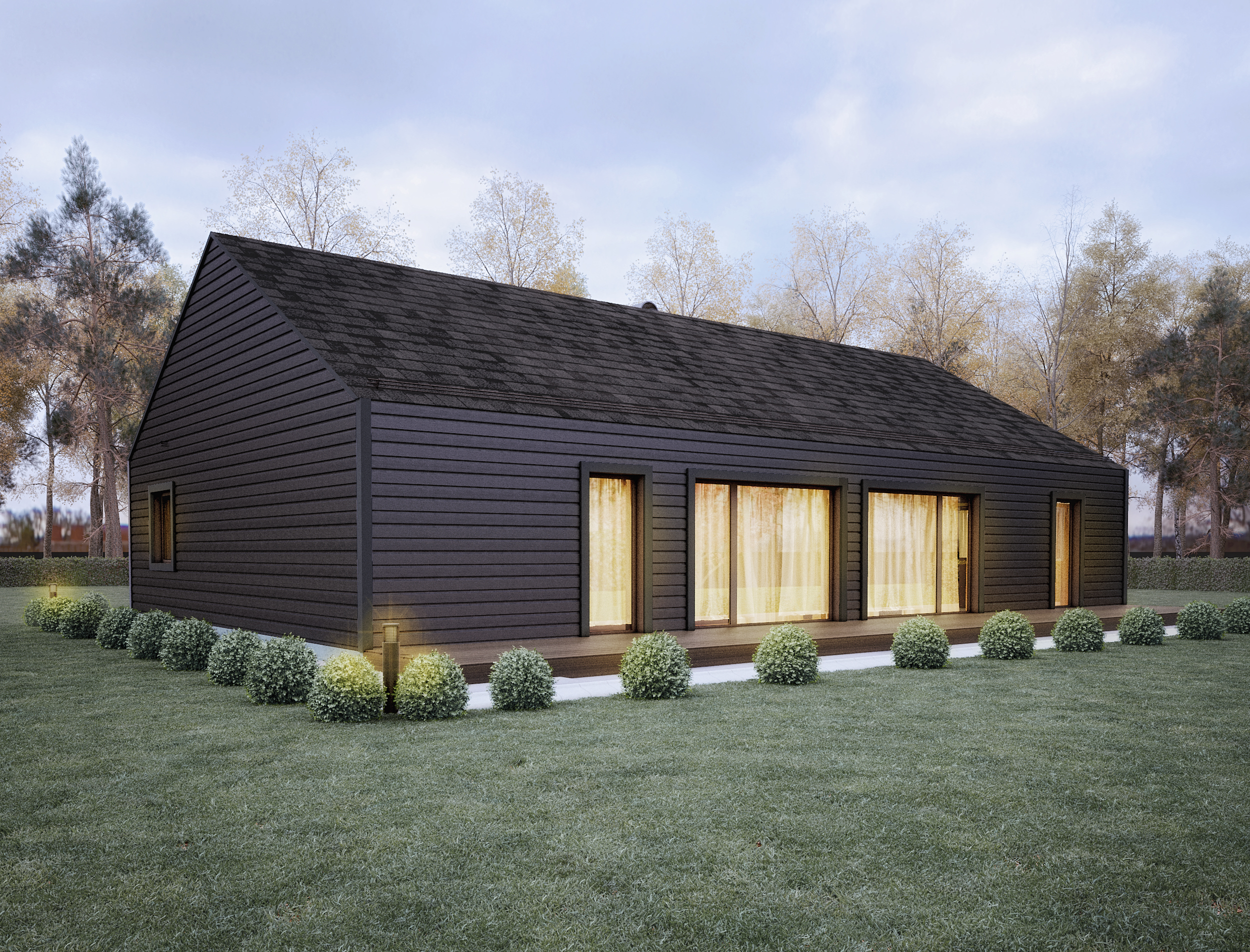 Model T118 nabízí komfortní rodinné bydlení se třemi ložnicemi, dvěma koupelnami a prostorným obývacím prostorem směřujícím na terasu.