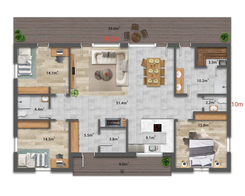 • Konstrukce: prefabrikovaný panelový systém z certifikovaného severského dřeva