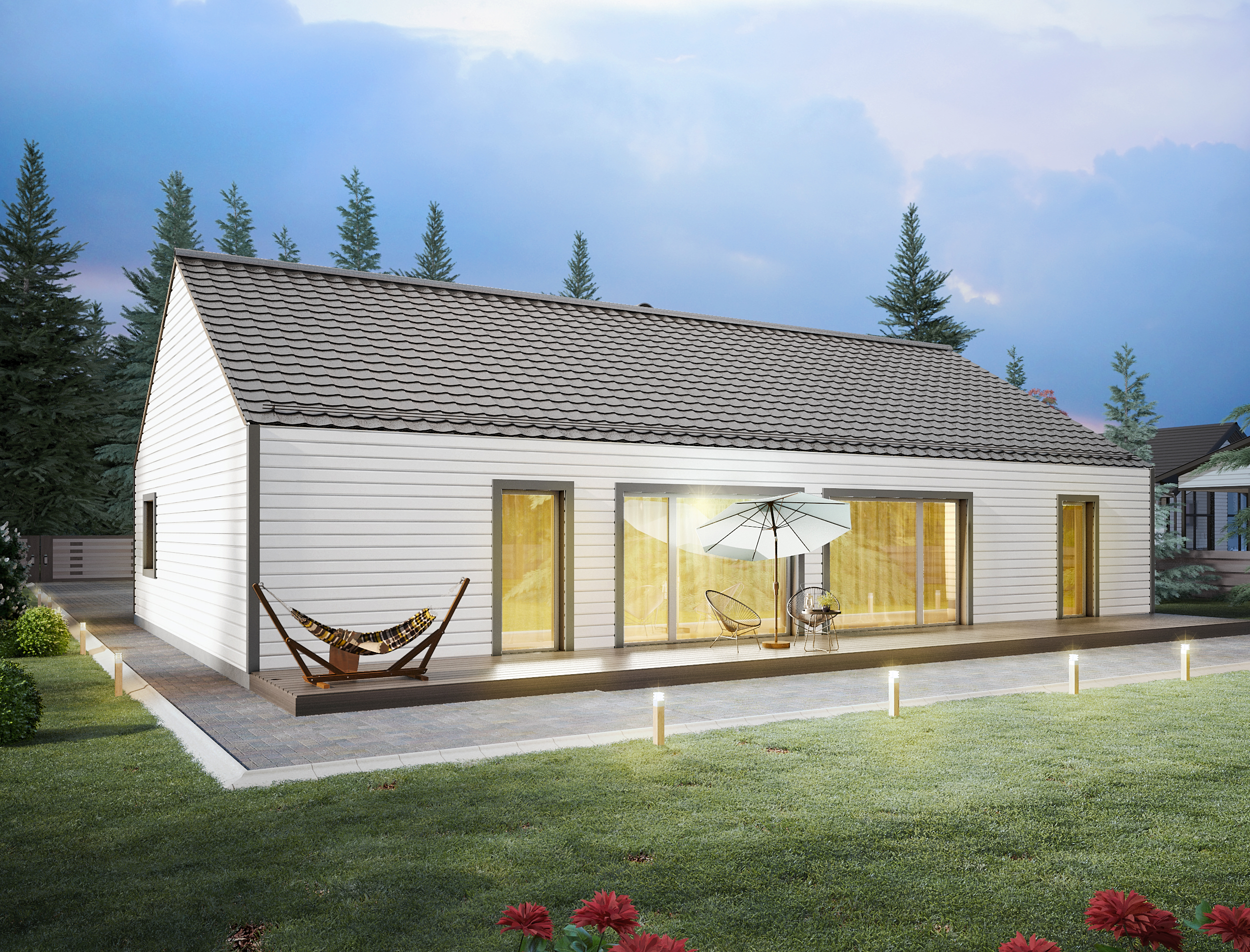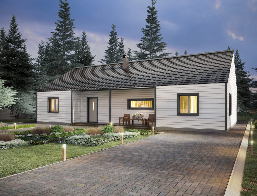 Moderní jednopodlažní rodinný dům se sedlovou střechou, nadstandardně prostorným obývacím pokojem a třemi komfortními ložnicemi.