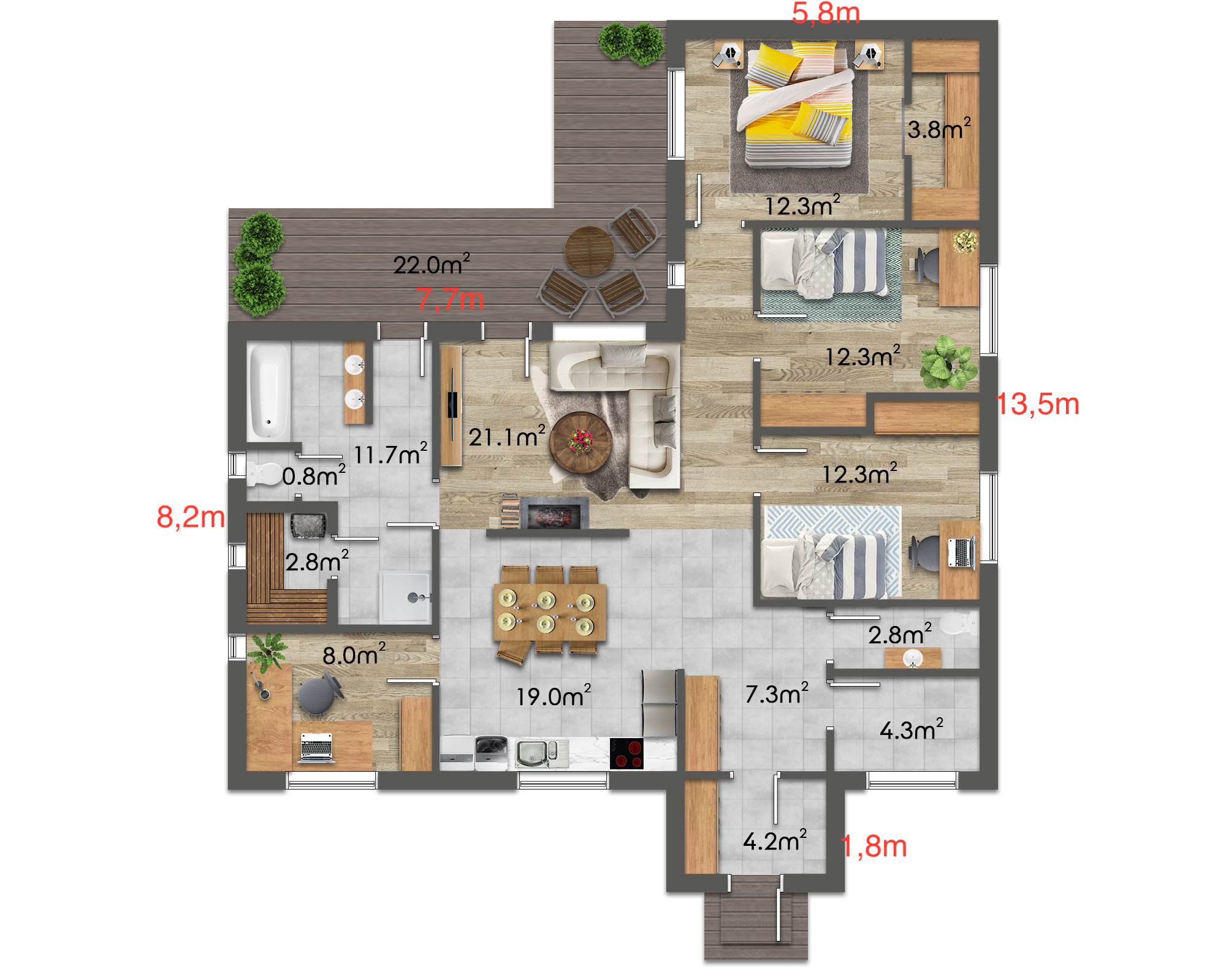 Díky chytré dispozici nabízí tři samostatné ložnice, velký obývací prostor a krytou terasu přístupnou přímo z obýváku.