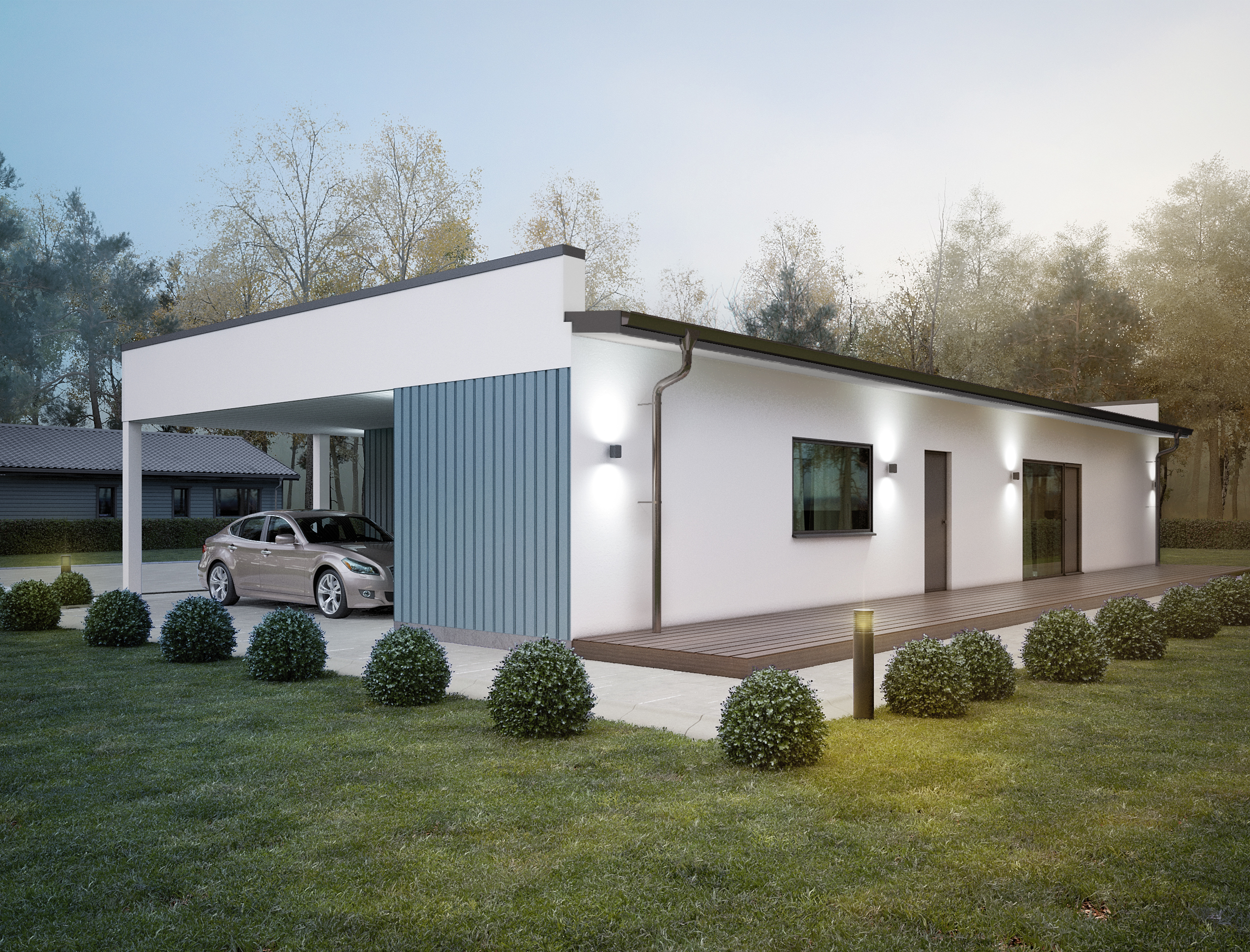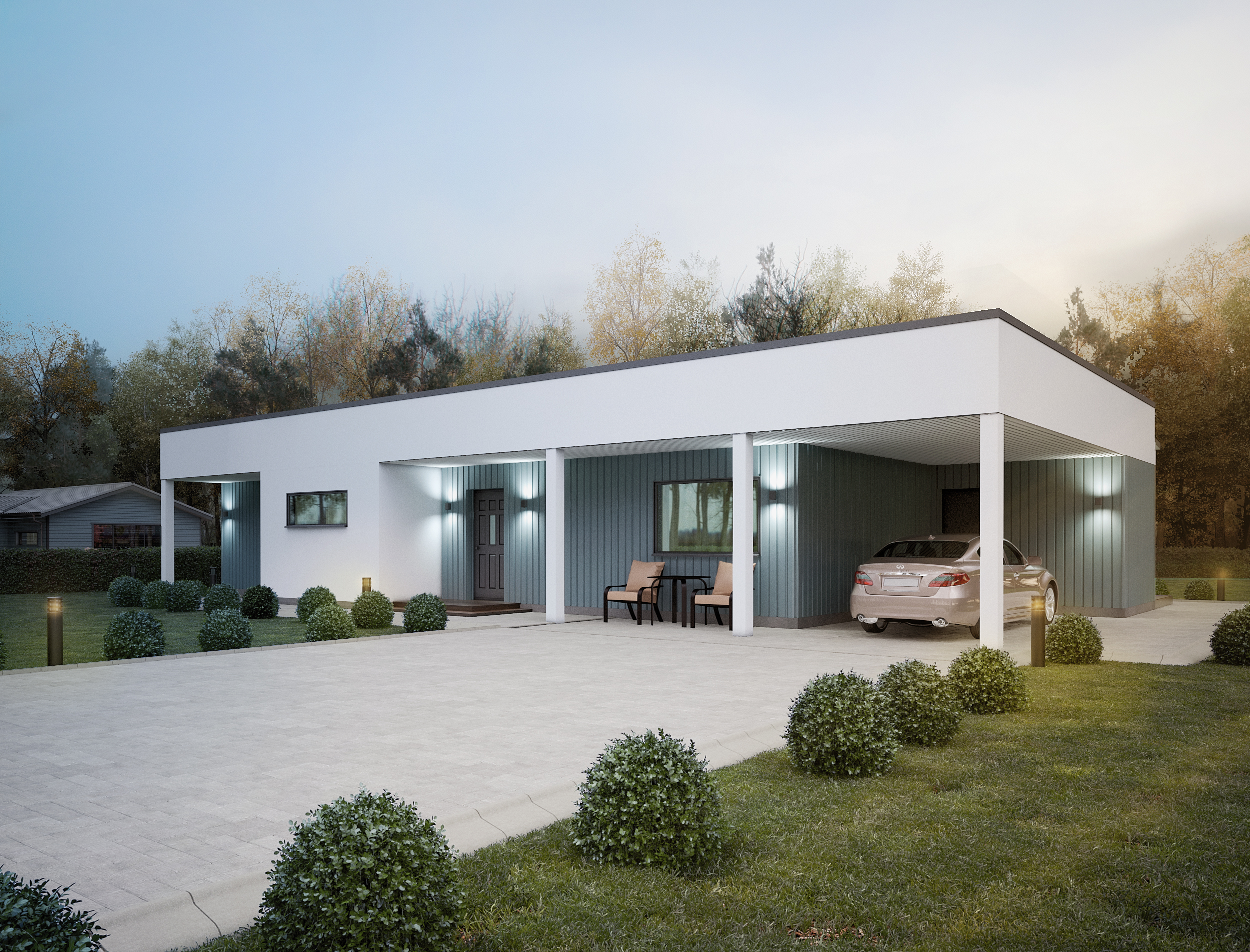 Moderní bungalov v kubickém stylu s integrovaným krytým parkovacím stáním.
