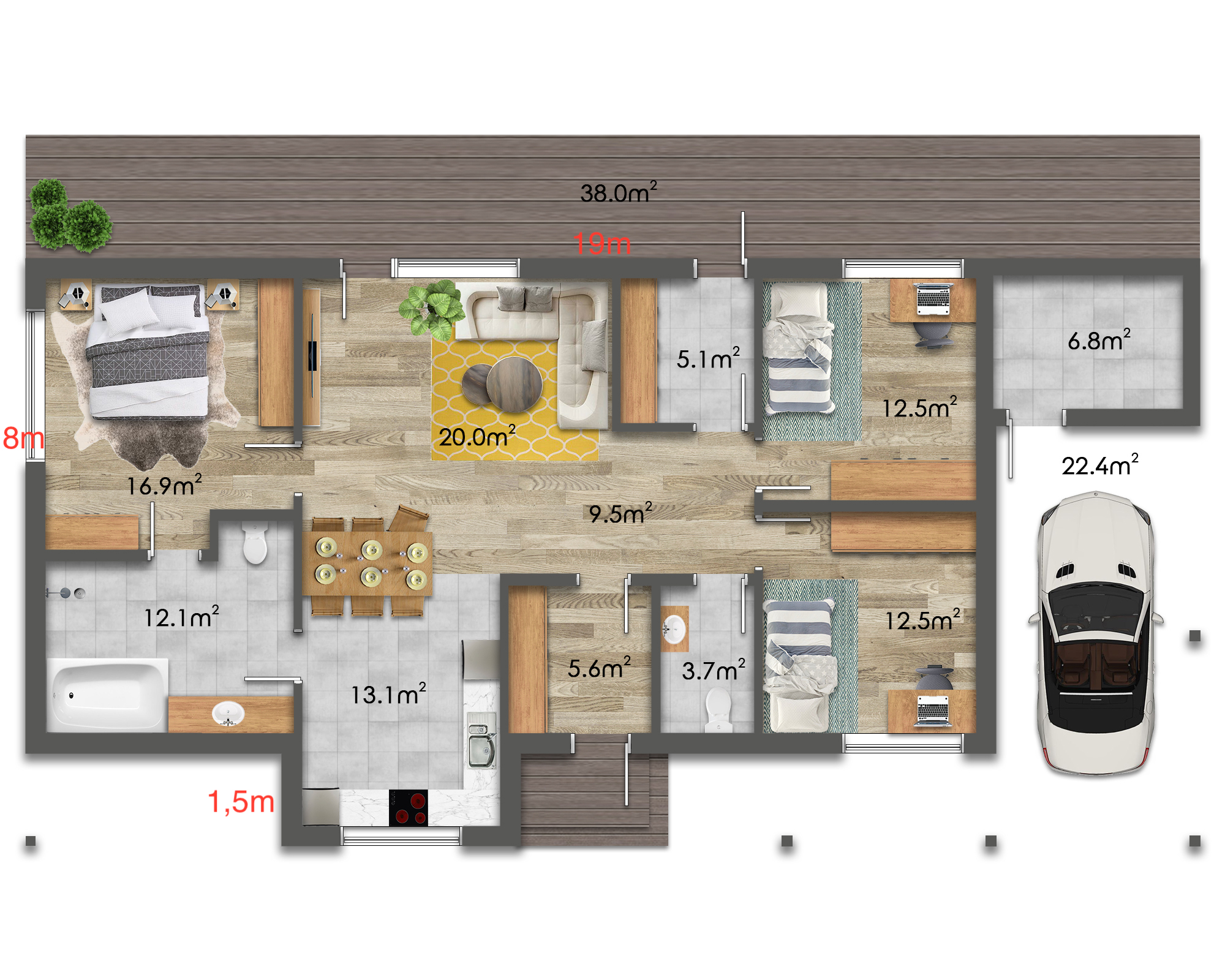 • Fasáda, okna, dveře a krytina nejsou součástí — určeno k dokončení
