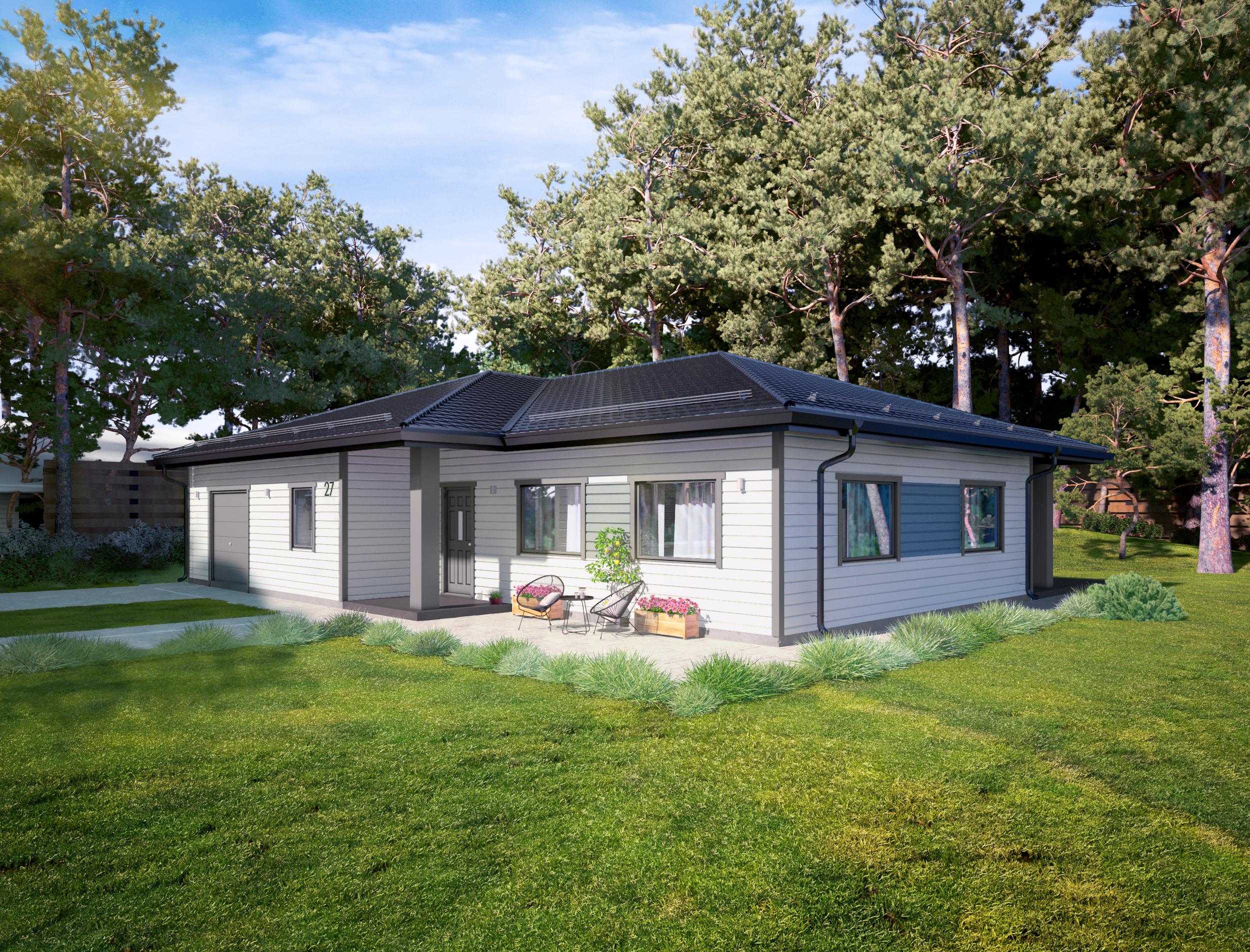Praktický jednopodlažní rodinný dům s integrovanou garáží, navržený pro pohodlné bydlení rodiny.