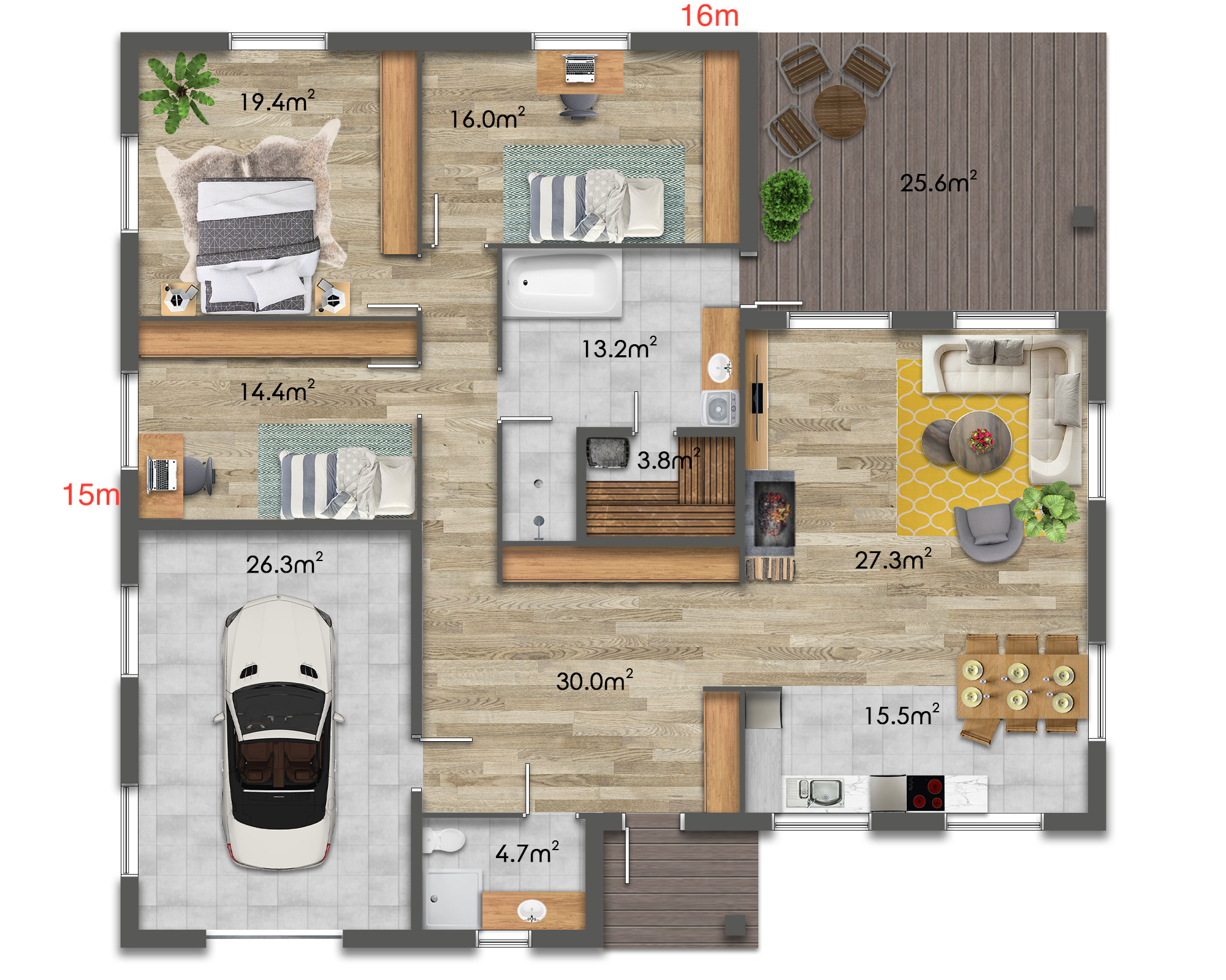 • Konstrukce: prefabrikovaný panelový systém z kvalitního severského dřeva