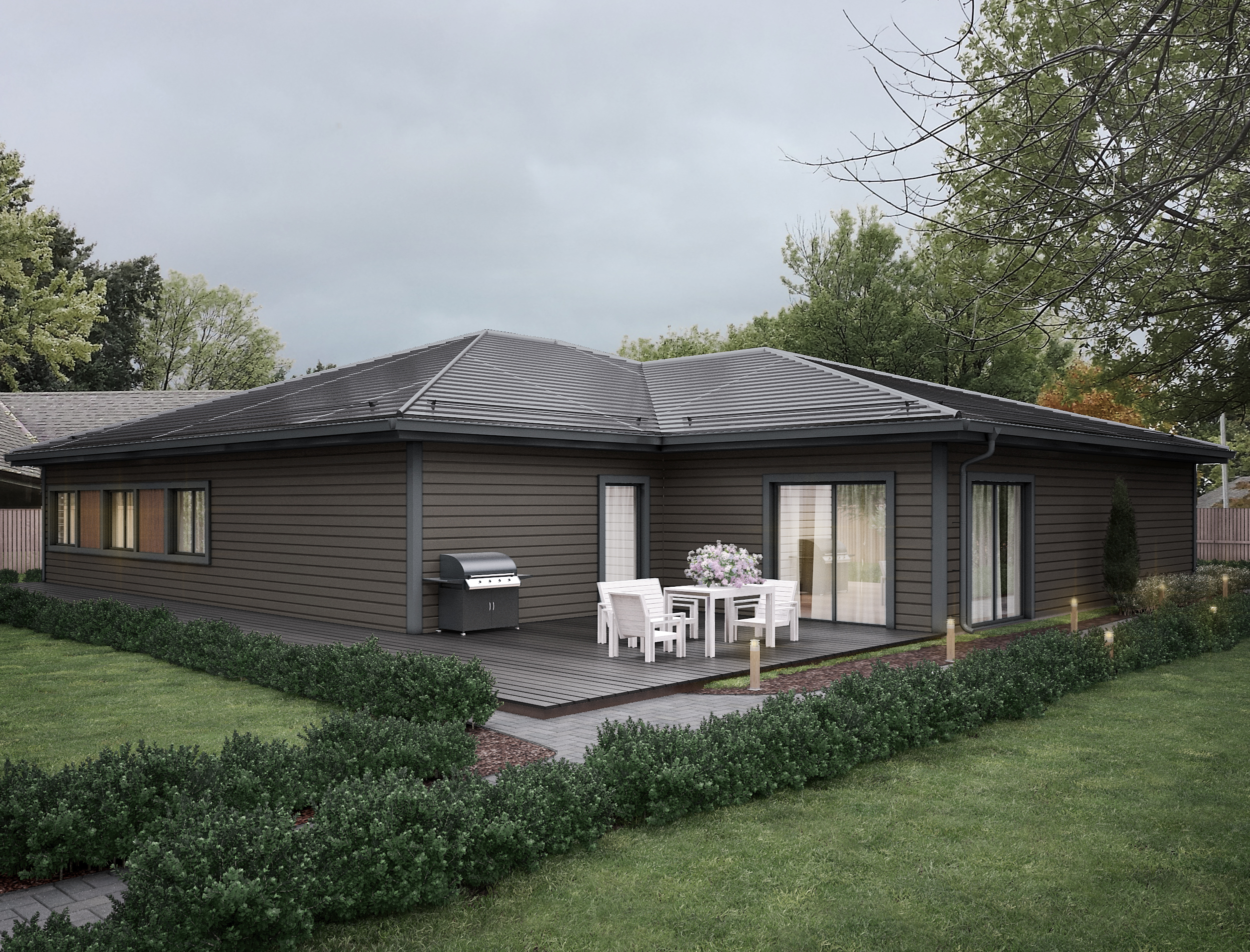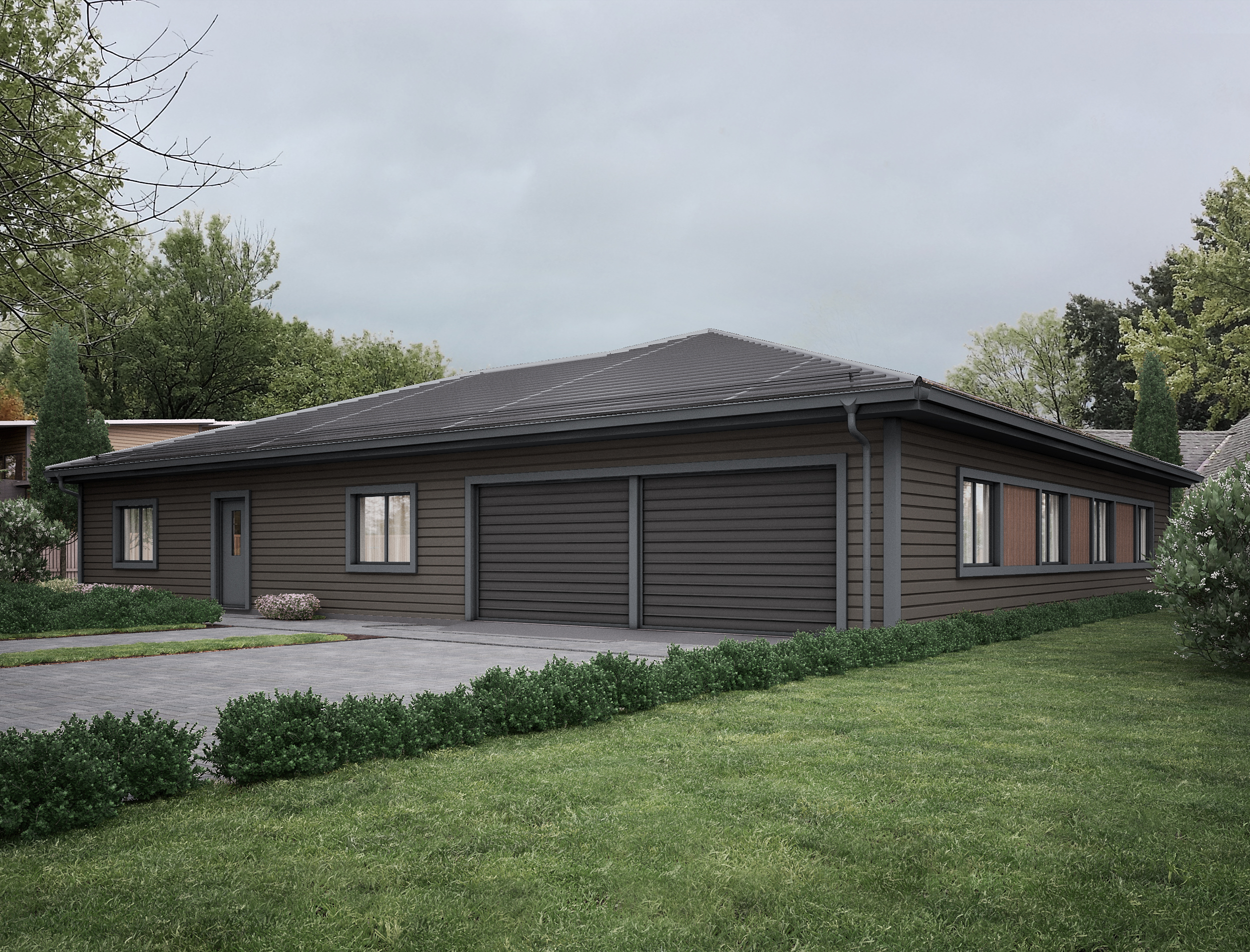 T133 je luxusní přízemní dům ve tvaru „U“ s velkorysou dispozicí a dvojgaráží. Ideální pro vícečlennou rodinu či klienty vyžadující nadstandardní komfort.