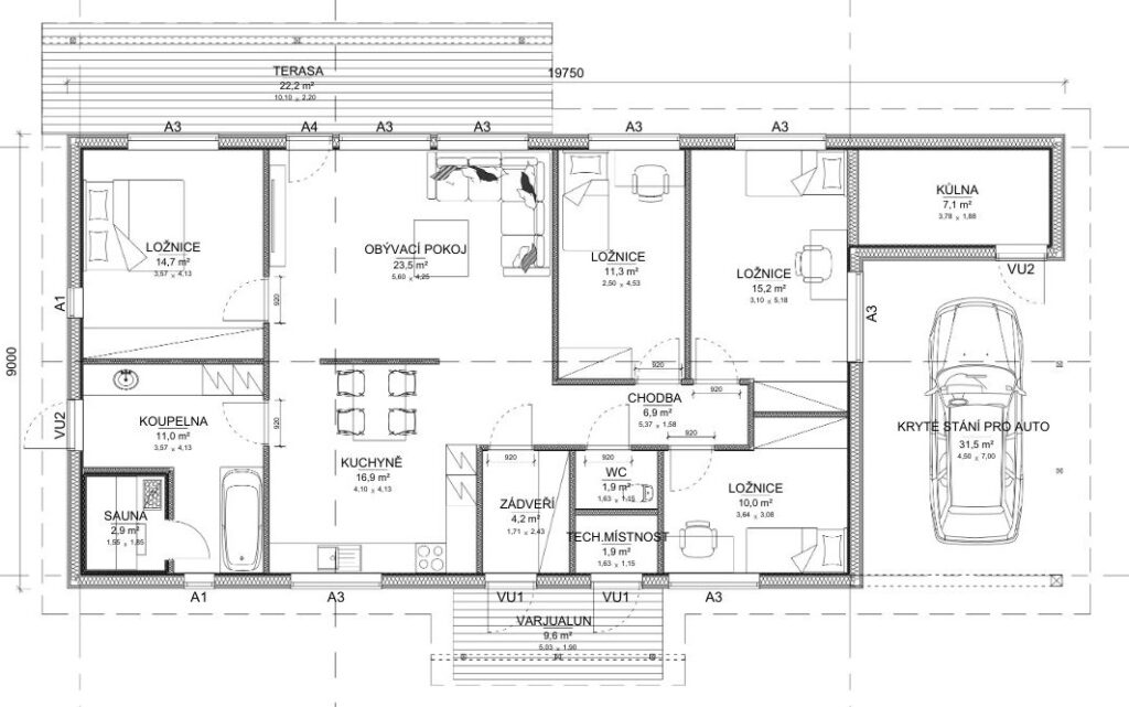 - Kryté parkovací stání: 31,5 m²