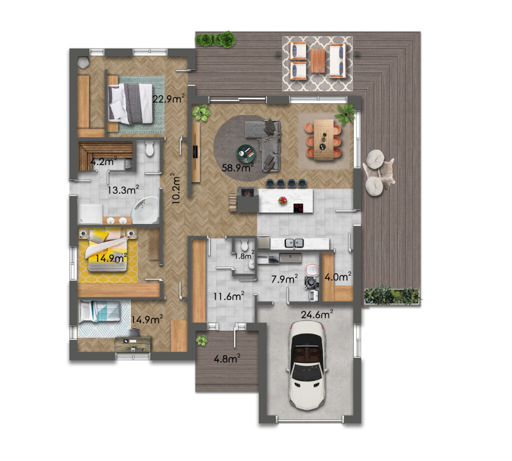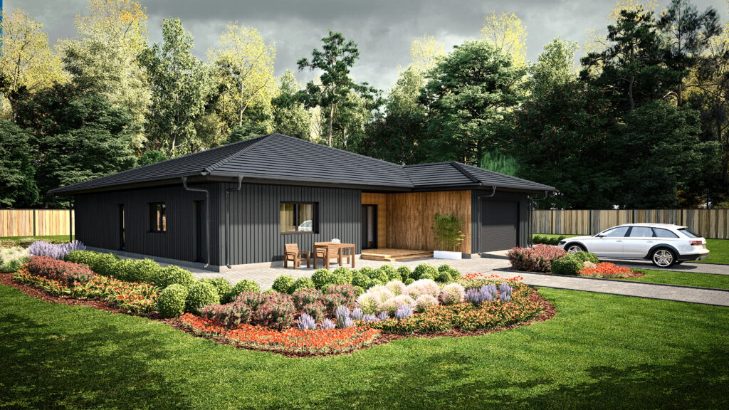 Reprezentativní přízemní dřevostavba s garáží a velkorysou terasou.