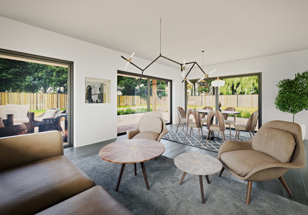Kombinace velkých prosklených ploch a prostorného obývacího pokoje vytváří ideální místo pro rodinný život.