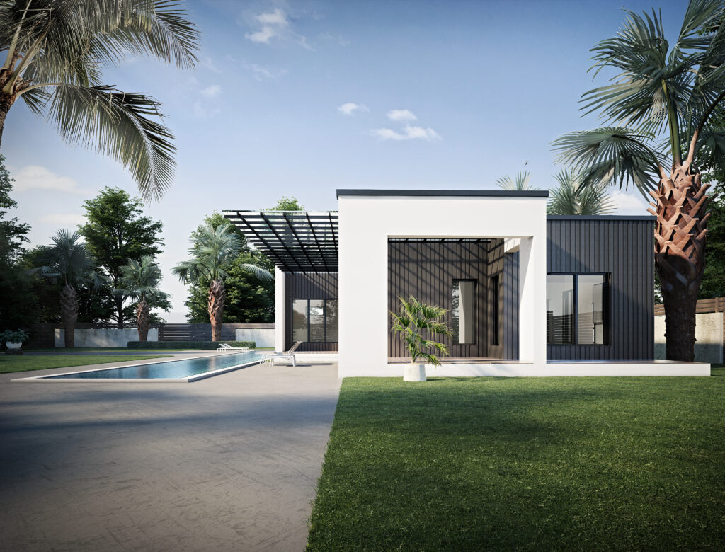 T147 – Timber 147 je elegantní přízemní rodinný dům v moderním minimalistickém stylu s plochou střechou a velkými prosklenými plochami.
