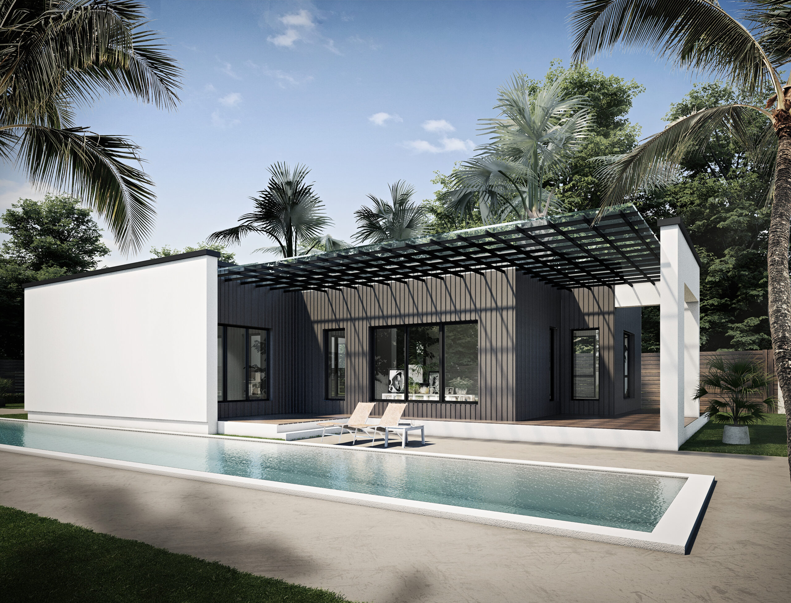 T147 – Timber 147 je elegantní přízemní rodinný dům v moderním minimalistickém stylu s plochou střechou a velkými prosklenými plochami.