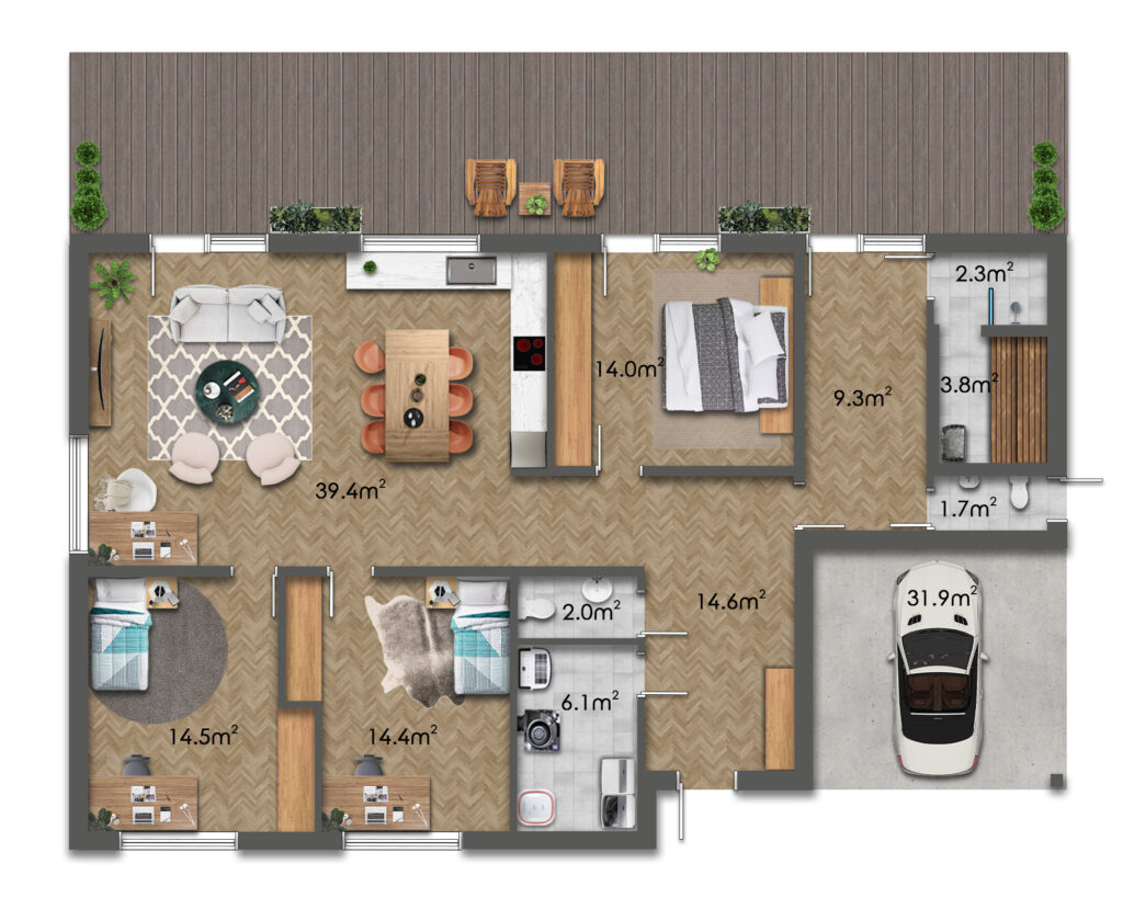 Dispozice je navržena tak, aby poskytla ideální komfort pro čtyřčlennou rodinu – tři ložnice, dvě koupelny, velký obývací pokoj s kuchyní a jídelnou, technickou místnost, saunu a kryté stání pro automobil.