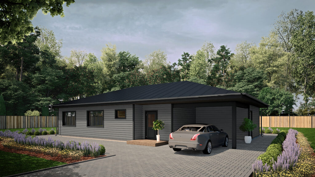 T153 – Timber 153 je moderní přízemní rodinný dům s čistou architekturou, praktickou dispozicí a prostornou krytou terasou.