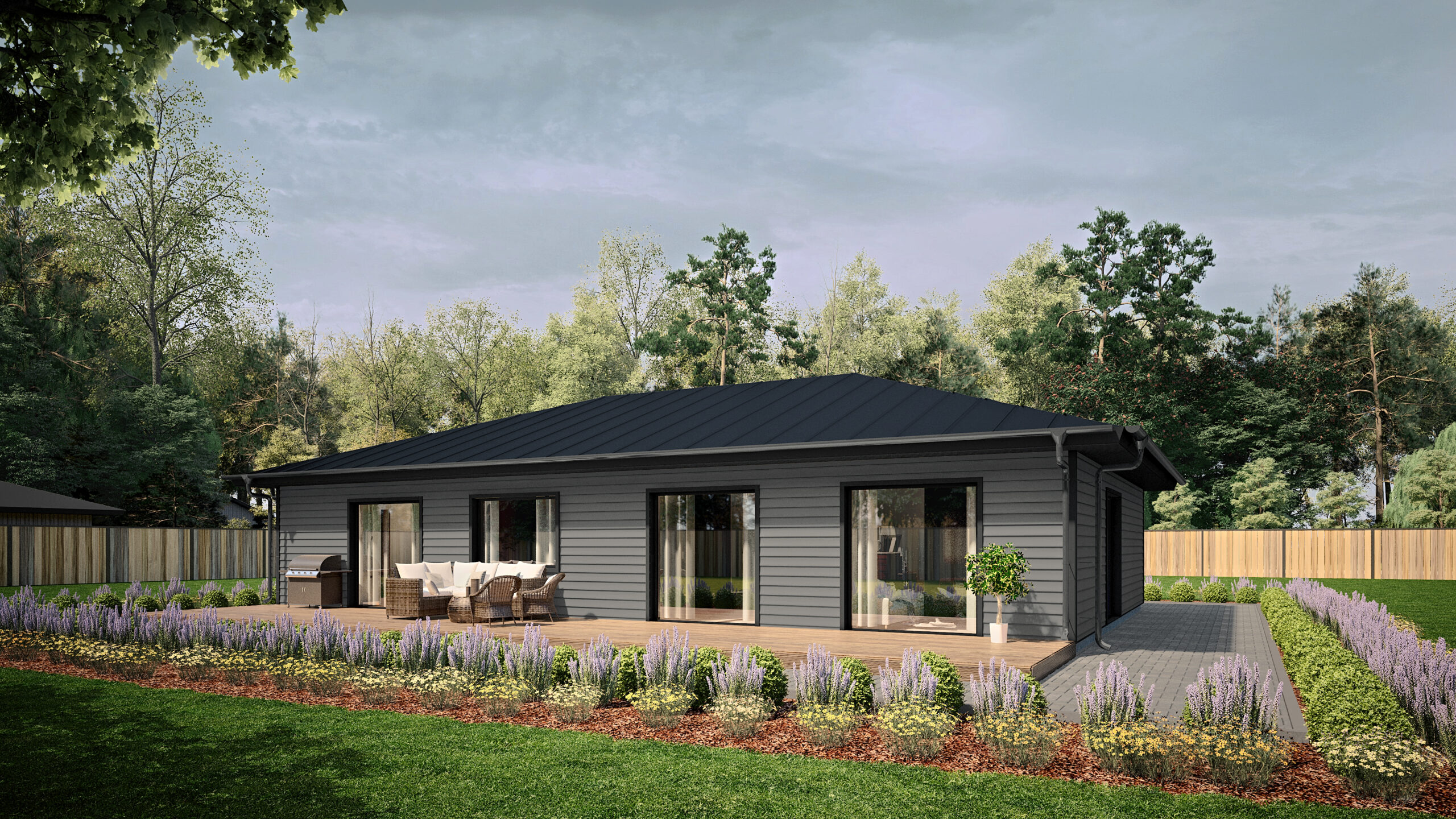 T153 – Timber 153 je moderní přízemní rodinný dům s čistou architekturou, praktickou dispozicí a prostornou krytou terasou.