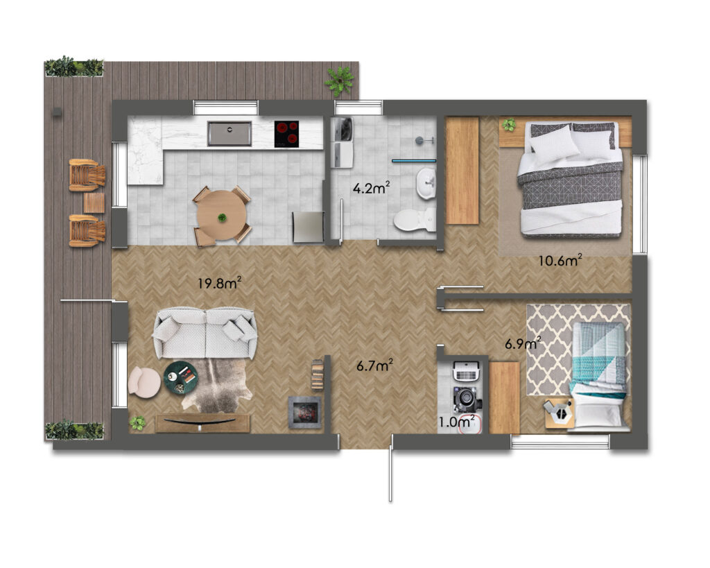 T154 – Timber 54 (Mari) je kompaktní a útulný dům ideální pro rekreační využití nebo jako startovací bydlení pro pár či menší rodinu.