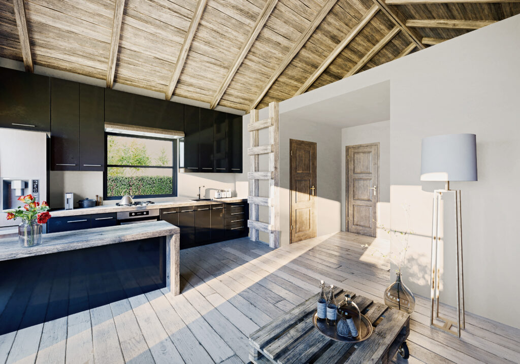 ✅ Otevřený obývací prostor s kuchyní a výhledem na terasu