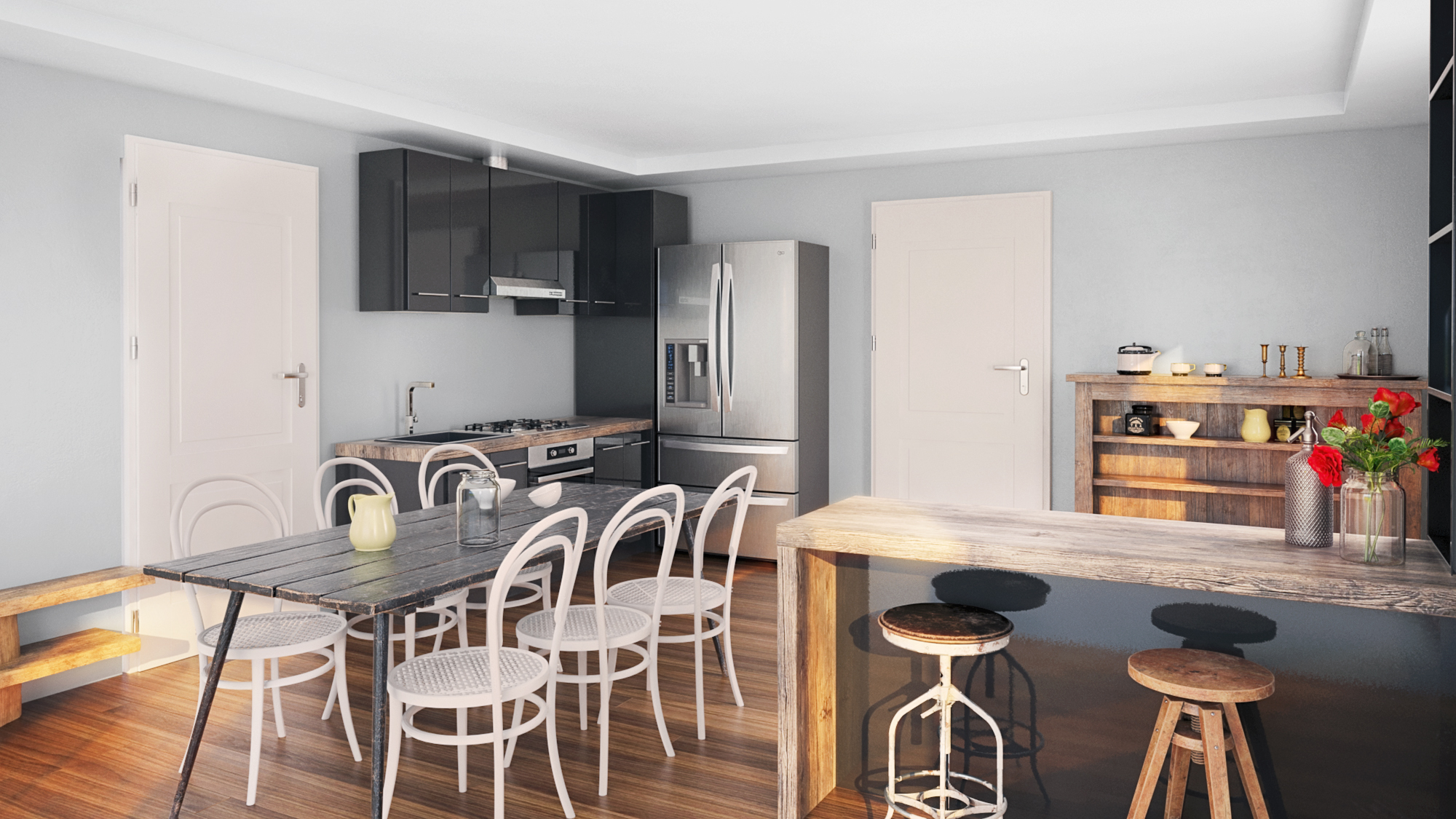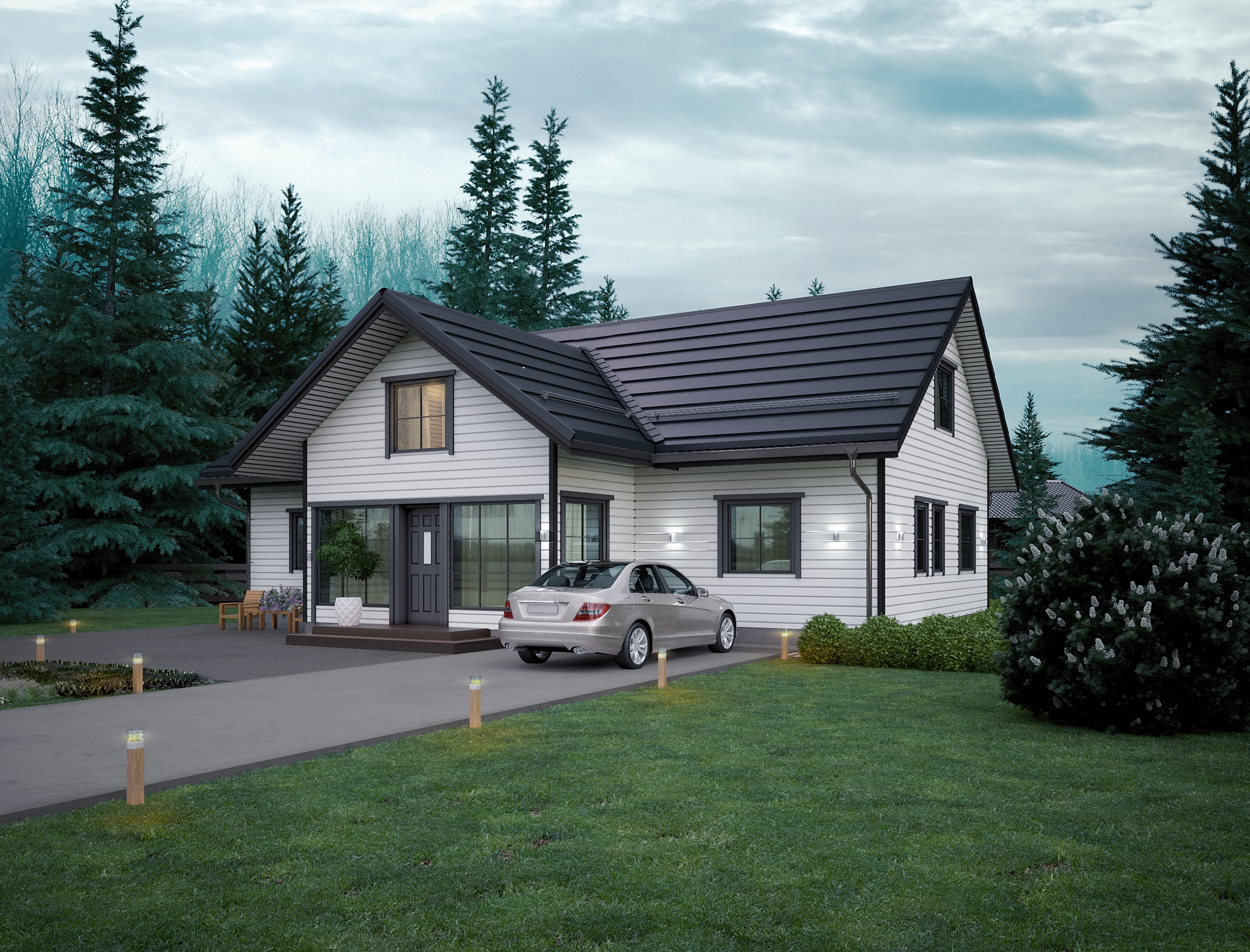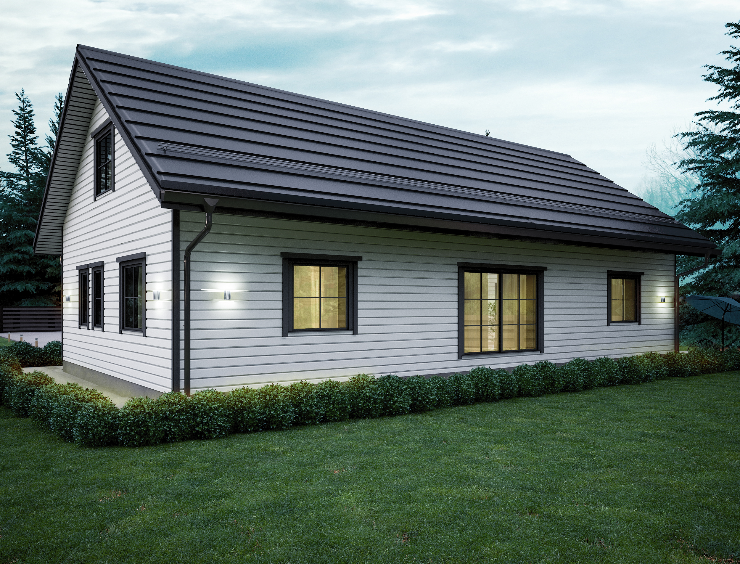 T204 – Timber 197 je prostorný dvoupodlažní rodinný dům v moderním skandinávském stylu s klasickou sedlovou střechou a elegantní kombinací bílé fasády a tmavých okenních rámů.