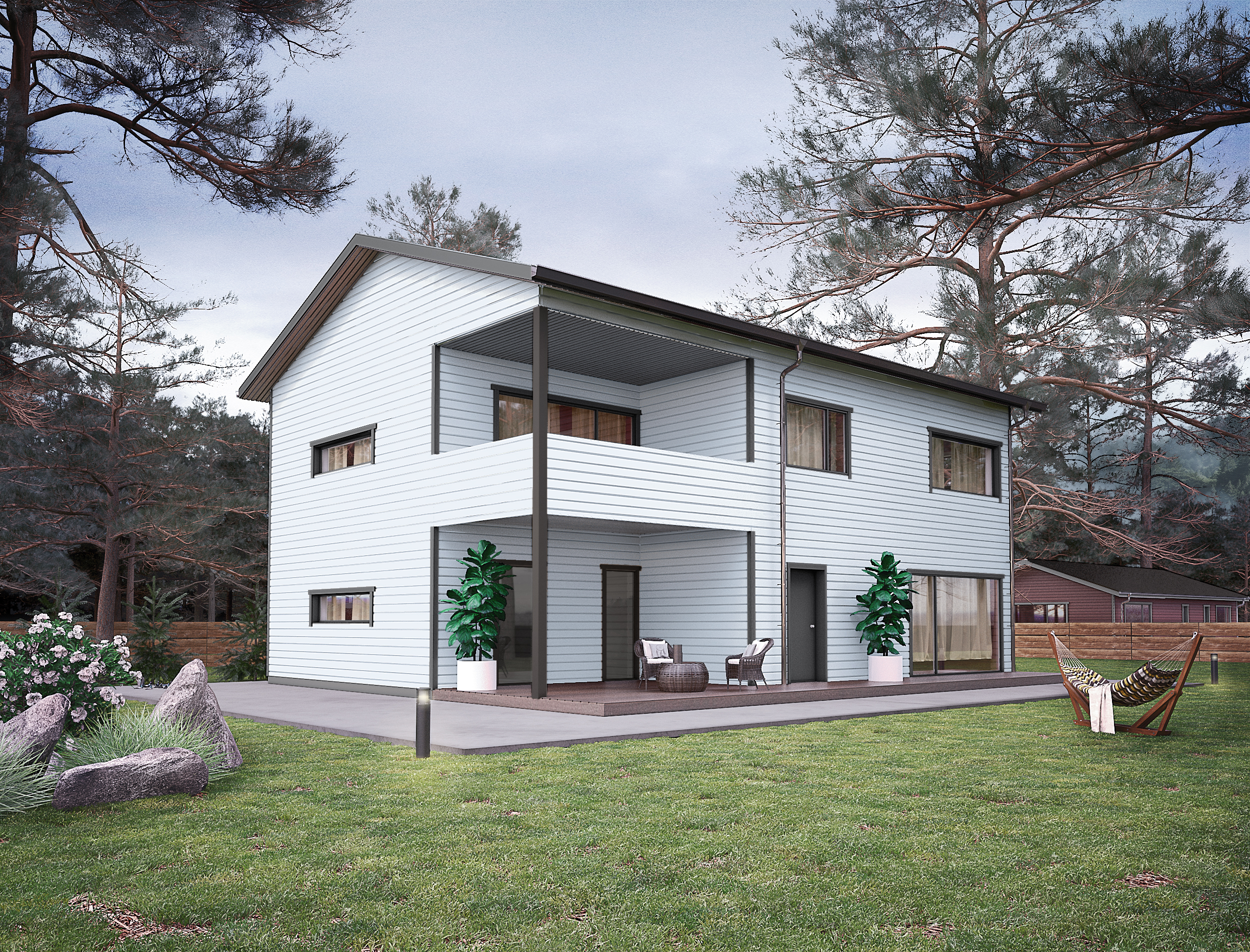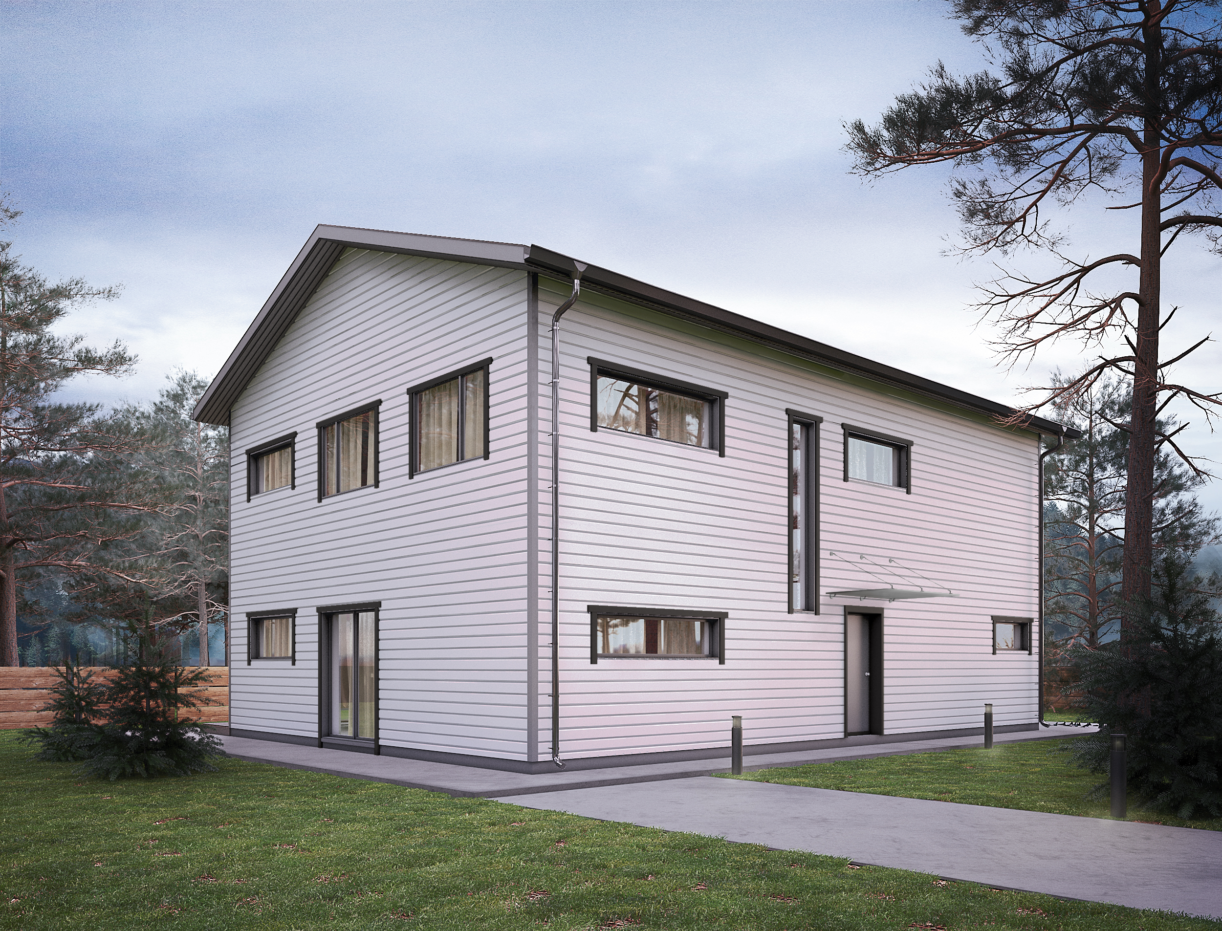 Dům vyniká kombinací funkčního uspořádání, čistých linií a kvalitní dřevěné konstrukce z prefabrikovaných panelů.
