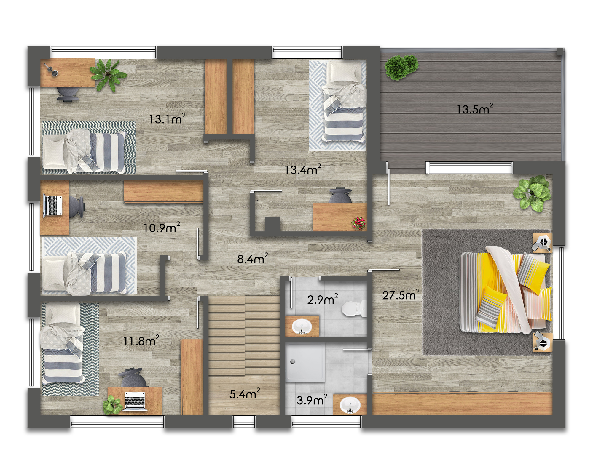 ✅ Až 5 ložnic a dva obytné prostory