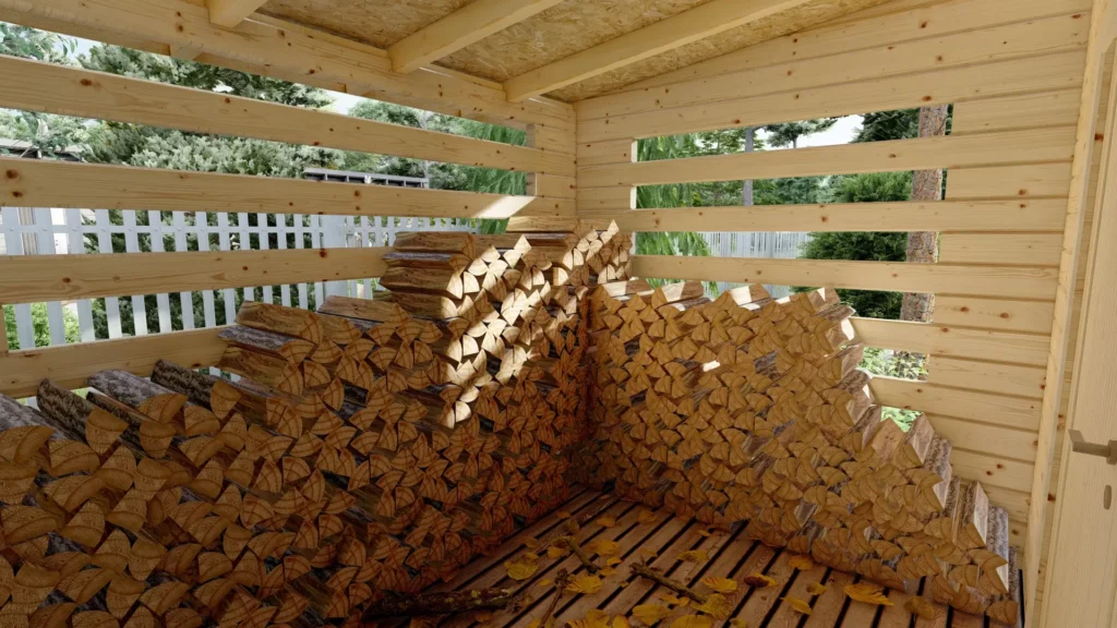 Dispozice je maximálně praktická – uzavřená část je vhodná pro nářadí, zahradní techniku nebo příslušenství ke krbu, zatímco otevřený prostor umožňuje efektivní skladování dřeva s dostatečnou ventilací.