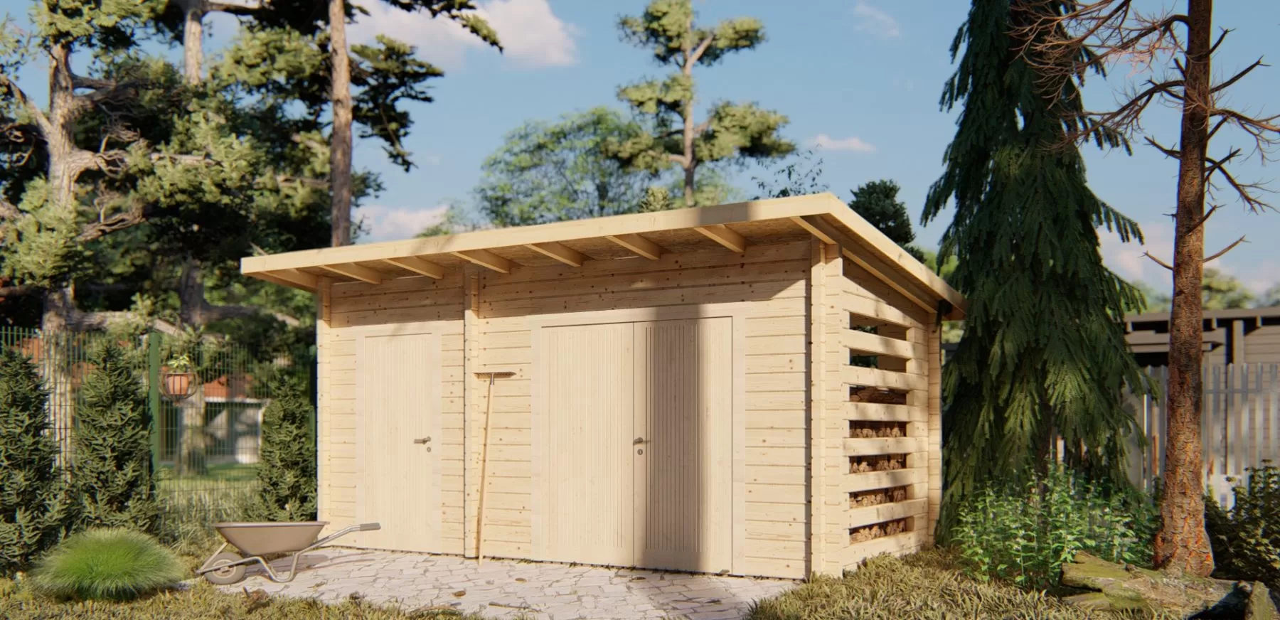 Dřevník (Woodshed) je praktický a robustní zahradní objekt z masivního smrkového dřeva o síle 70×135 mm, navržený pro efektivní uskladnění palivového dřeva a zahradního nářadí. Díky jednoduché, ale velmi funkční konstrukci nabízí kombinaci uzavřeného skladu a uzavřeného větraného prostoru pro dřevo, který zajišťuje přirozenou cirkulaci vzduchu a rychlé vysychání polen.