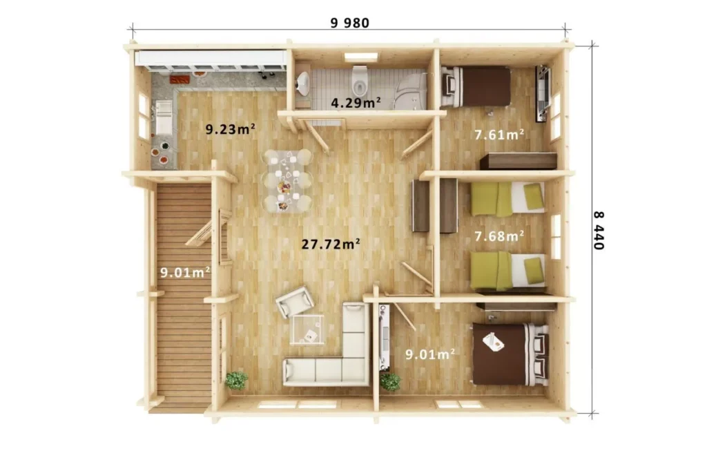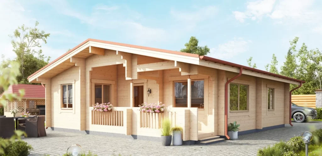 Felmoor 92 je moderní přízemní dům z masivního dřeva s vnější stěnou 92×160 mm, v nadčasovém skandinávském stylu s pultovou střechou a krytou verandou. Vyniká velkým prosvětleným obytným prostorem, třemi samostatnými pokoji a prakticky navrženou dispozicí, která umožňuje pohodlné bydlení i rekreační využití.