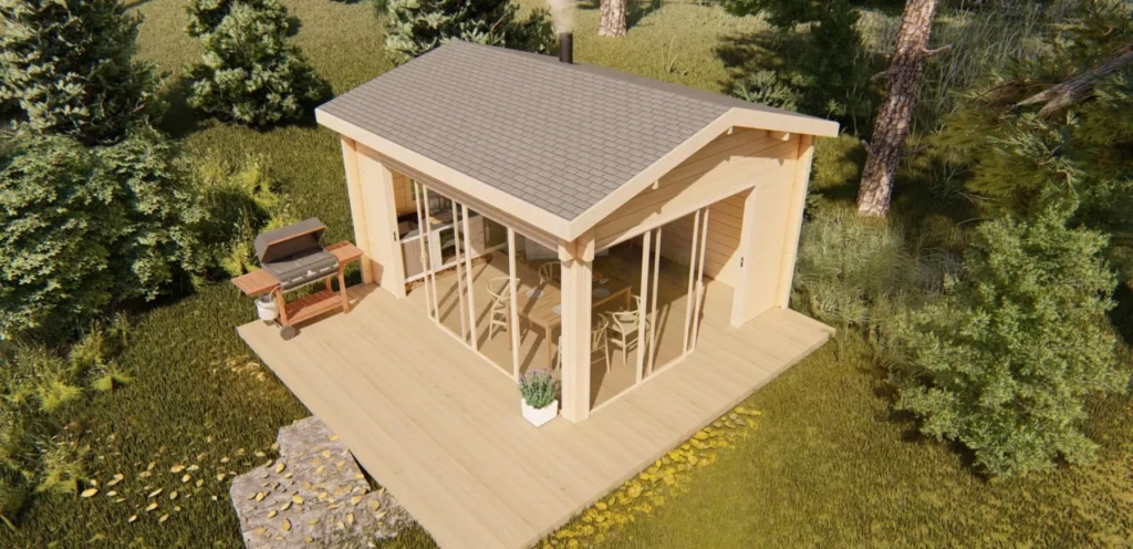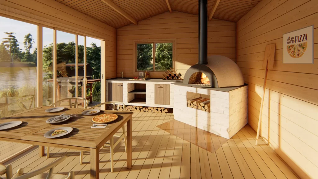 Díky velkým proskleným plochám, otevřenému prostoru a možnosti instalace pizza pece, grilu či kuchyňského zázemí vytváří jedinečnou atmosféru pro soukromé i komerční využití. Masivní dřevěná konstrukce zajišťuje dlouhou životnost, stabilitu a přirozený, luxusní vzhled, ideální pro zahrady, glamping resorty, restaurace i rekreační areály.