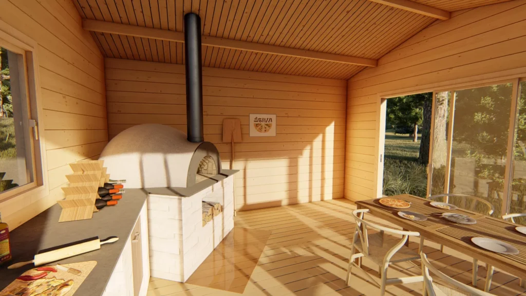 Pizza House je stylová gastronomická zahradní chata z masivního dřeva, vyrobená z pevné dřevěné konstrukce o profilu 92 × 160 mm. Je navržena především jako místo pro venkovní vaření, pečení pizzy a setkávání s přáteli či hosty, ale zároveň ji lze využít i jako relaxační či společenský prostor.
