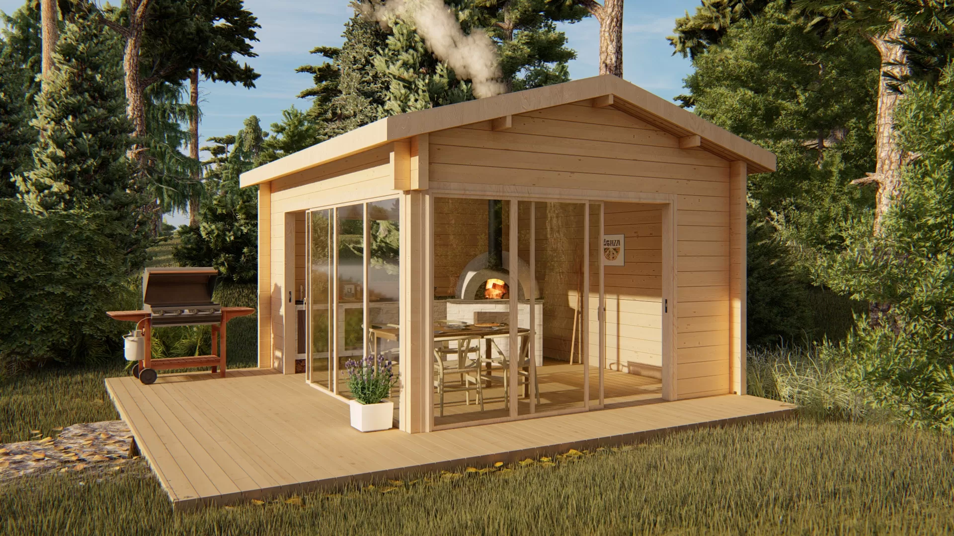 Pizza House je stylová gastronomická zahradní chata z masivního dřeva, vyrobená z pevné dřevěné konstrukce o profilu 92 × 160 mm. Je navržena především jako místo pro venkovní vaření, pečení pizzy a setkávání s přáteli či hosty, ale zároveň ji lze využít i jako relaxační či společenský prostor.