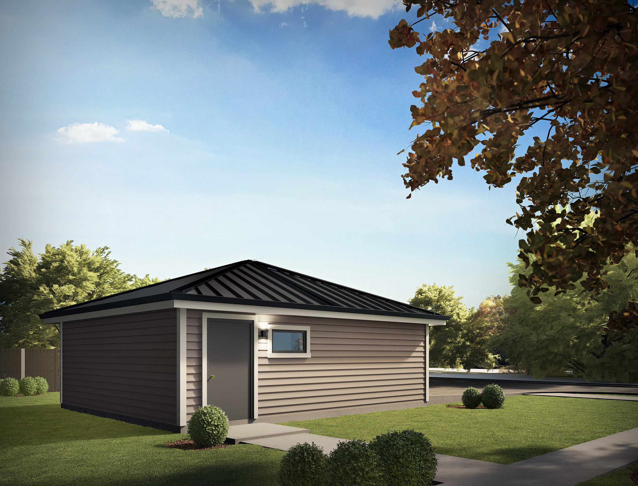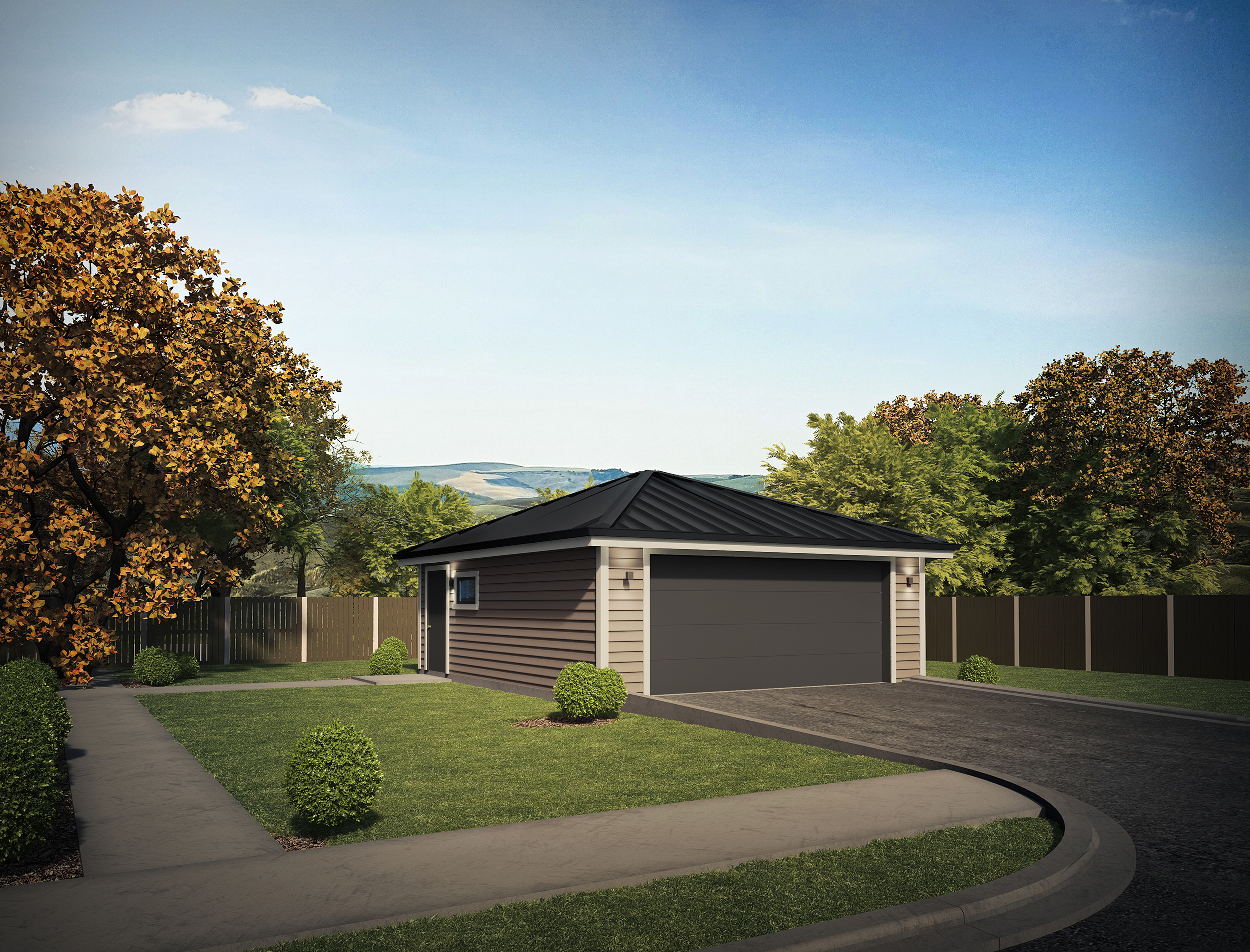 Elegantní dvojgaráž v moderním severském stylu s praktickým půdorysem a valbovou střechou.