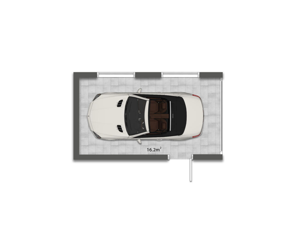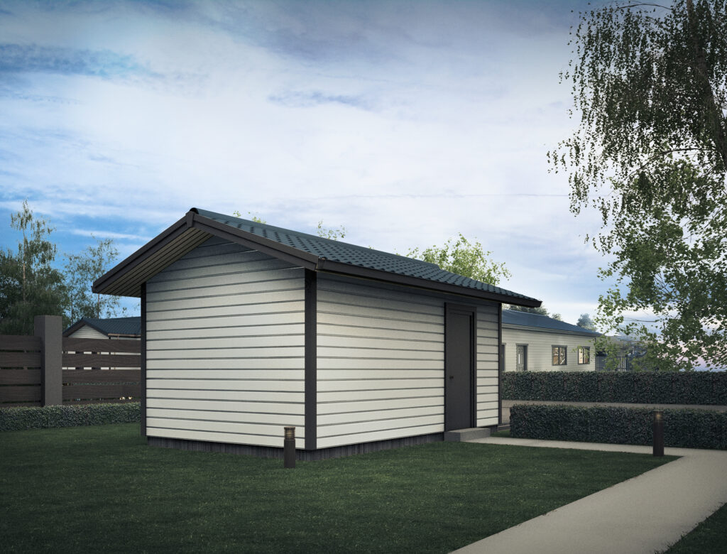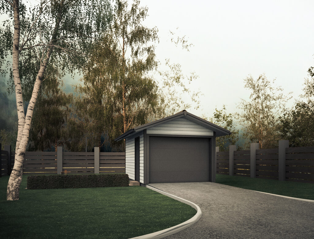 Kompaktní garáž pro jedno vozidlo v jednoduchém skandinávském stylu.